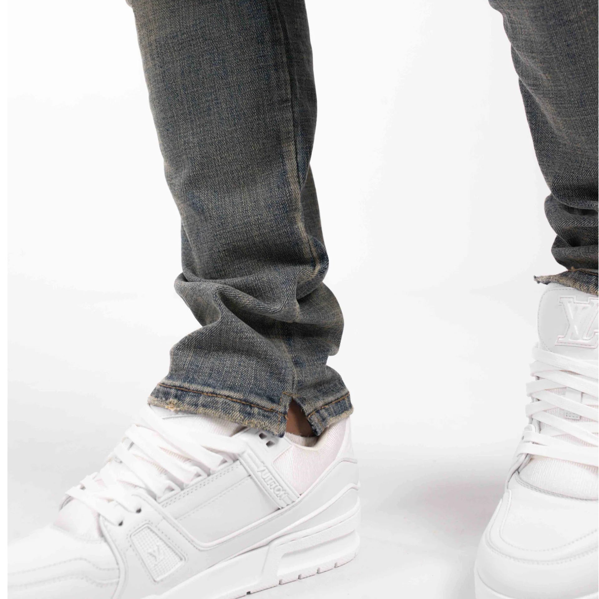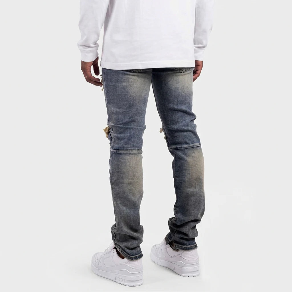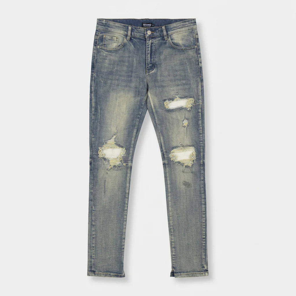 De Ripped Archive Slightly Split Jeans van Rivero is een tijdloos streetwear-item met een moderne twist. Deze slim-fit denim heeft een subtiel gespleten detail en is voorzien van distressed accenten met scheuren op de knieën, gecombineerd met een vervaagde wassing voor een authentieke, gedragen look.